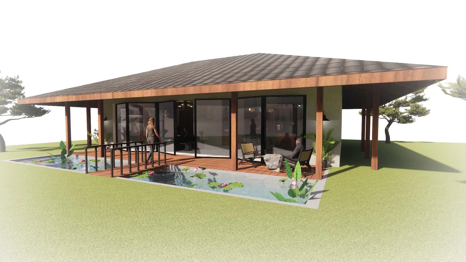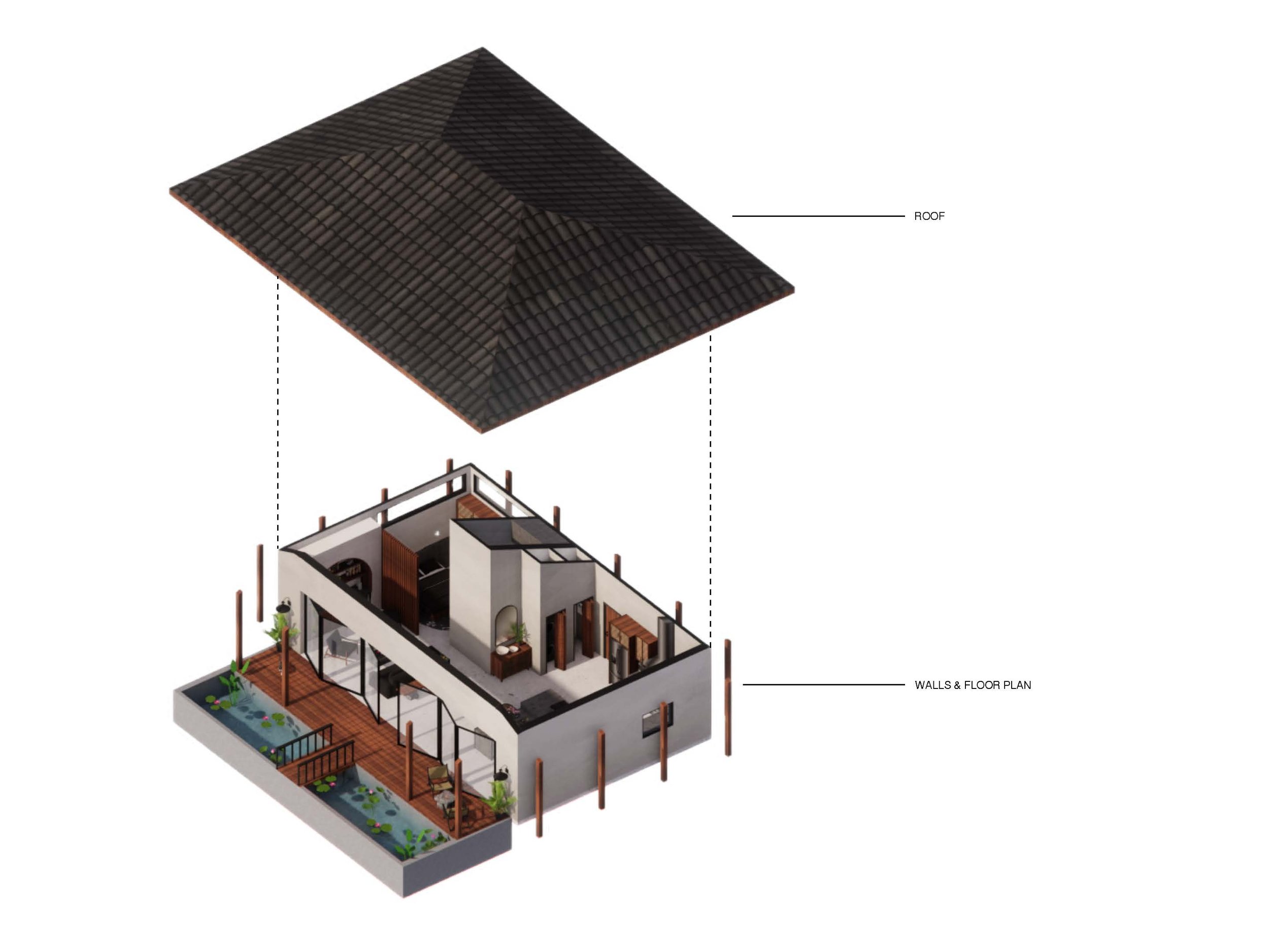 The Hat is a modern accessory dwelling unit inspired by Vietnamese design. Drawing inspiration from the Vietnamese rice hat, the roof takes on a modern look with beams that replicate the supporting structures under rice hats. The roof extends outward and hangs over the foundation of the accessory dwelling as if it were a giant hat. It incorporates fresh takes on traditional shapes found in woven rice hats, fish traps, and baskets. This creates an overall space that utilizes materials and textiles from Vietnamese culture and architecture/interior.